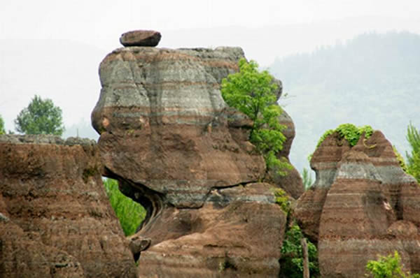 這些石柱不但顏色各異,而且大小不等。有的高達(dá)七、八米,而有些則像半埋于地下的巨獸骨架。一位村民告訴記者,現(xiàn)在石林沒有以前壯觀,都長渣子(灌木)了。原因是由于山頂樹木減少,雨水將泥土帶下山,很多石頭都被埋在土下,后來這些地方都開墾了農(nóng)田,石林也被永久覆蓋。