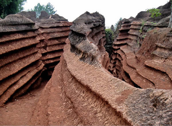 在路邊一棵樹下,一排直徑有30厘米粗、1米多高,排列得像牙齒一般細(xì)密的石柱躲在樹蔭下,似乎在躲著陽光。幾個多小時的探尋過程中,“石林”總是讓人驚喜,爬行的劍龍、攀行的巨猿、雅致別趣的“蓮花寶座”和莊嚴(yán)的“佛手”,讓人流連忘返 ……當(dāng)?shù)卮迕裣蛴浾呓榻B道,這只是整個“石林”的一部分,最大的一片石林大約方圓600畝左右,大部分是紅褐色。前幾年有人帶著專家來考察,說這片石林已經(jīng)沉睡了4億年,是揚(yáng)子古海海底沉積的混合泥砂的碳酸鹽物質(zhì)形成的巖石,再經(jīng)地殼運(yùn)動和侵蝕、溶蝕作用,就形成今天的奇觀。但卻由于投入資金量及交通等方面的考量,遲遲沒有人投資。