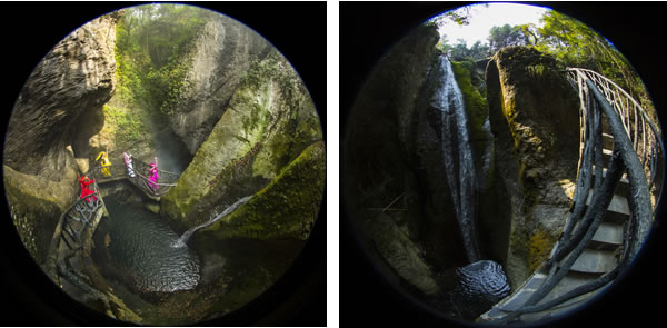走在吊橋中間,必須保持自身的平衡方能安全通過,不然就會在吊橋上搖擺不定。走出仙女峽谷,往下看,深不見底,七潭七瀑在奇險(xiǎn)之中不乏壯觀,這里曾發(fā)生過跳潭救女的故事。