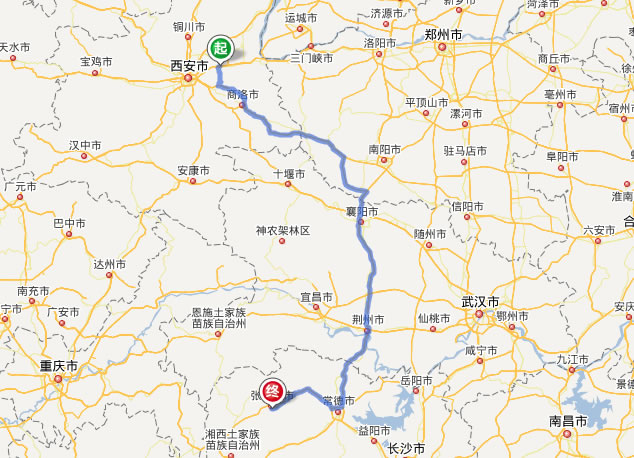 左右,沿途經過渭南——商洛——襄陽——荊門——荊州——澧縣——石門縣——慈利縣——張家界市。