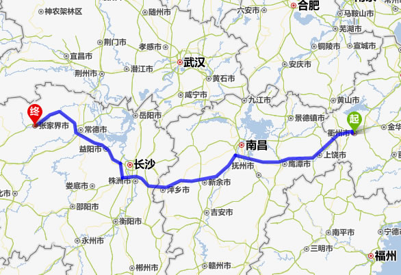 左右,沿途經過衢州市——上饒市——鷹潭市——新余市——宜春市——萍鄉(xiāng)市——株洲市——湘潭市——寧鄉(xiāng)縣——益陽市——常德市——慈利縣——張家界。