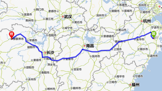 左右,沿途經過天臺——新昌縣——金華市——衢州市——上饒市——鷹潭市——新余市——宜春市——萍鄉(xiāng)市——株洲市——湘潭市——寧鄉(xiāng)縣——益陽市——常德市——慈利縣——張家界。
