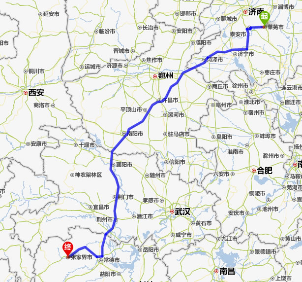 左右,沿途經過萊蕪——泰安——濟寧——菏澤市——蘭考縣——許昌市——平頂山——南陽——襄陽——荊門——荊州——常德(也可以走國道經澧縣、石門縣)——慈利——張家界。